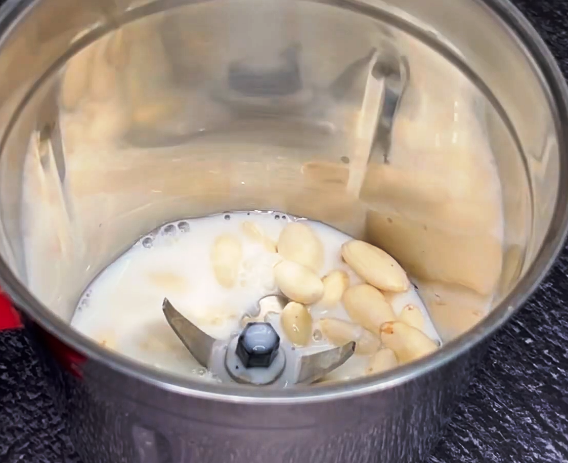 - Add 1/2 cup milk and almonds in a grinding jar. Grind it until you get the desired consistency. Keep the almond paste aside.