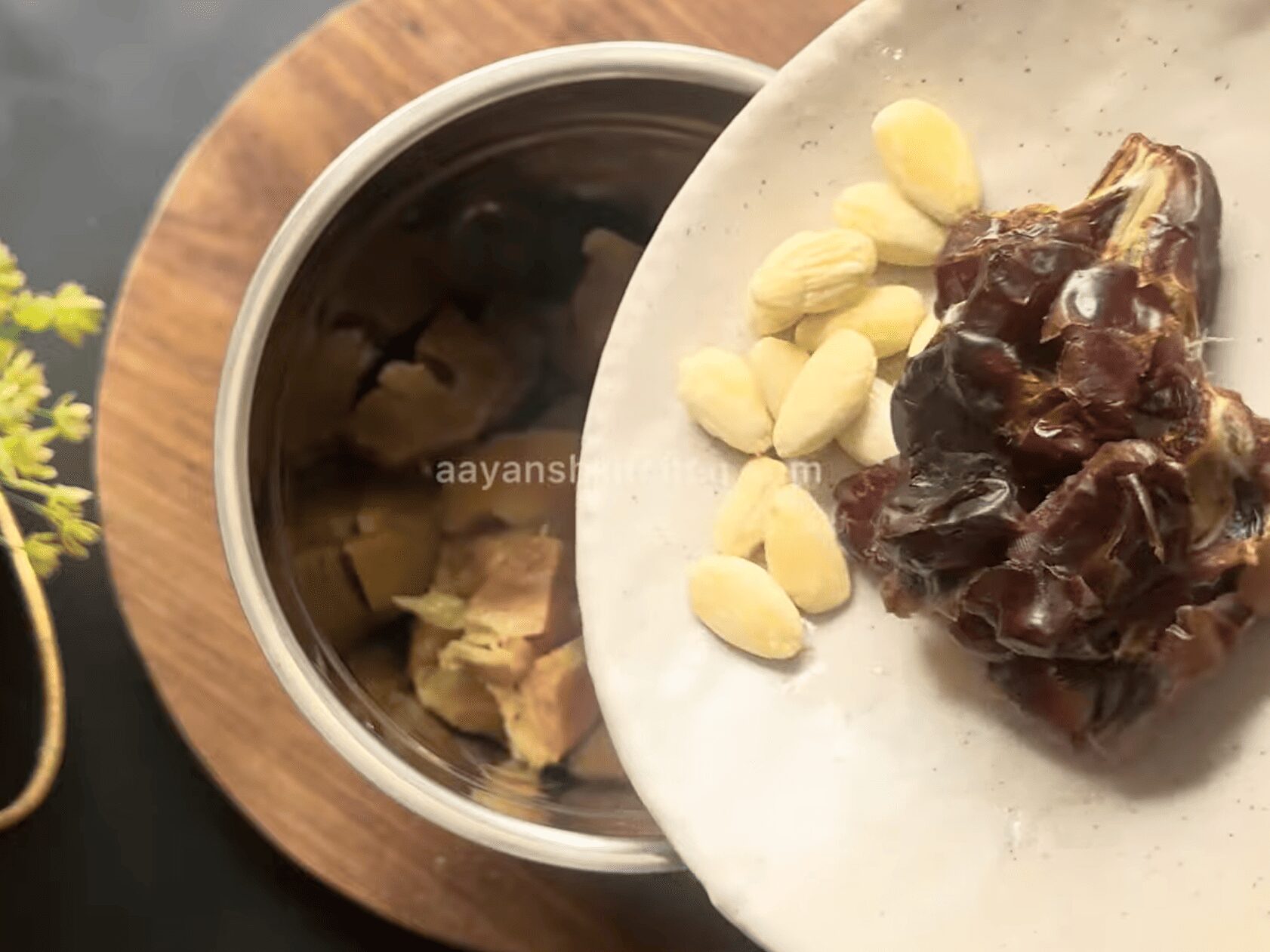 • Take a large grinding jar. Add the chikoo pulp to the grinding jar along with seven to eight soft dates(seeds removed), and 10-12 soaked and peeled almonds.