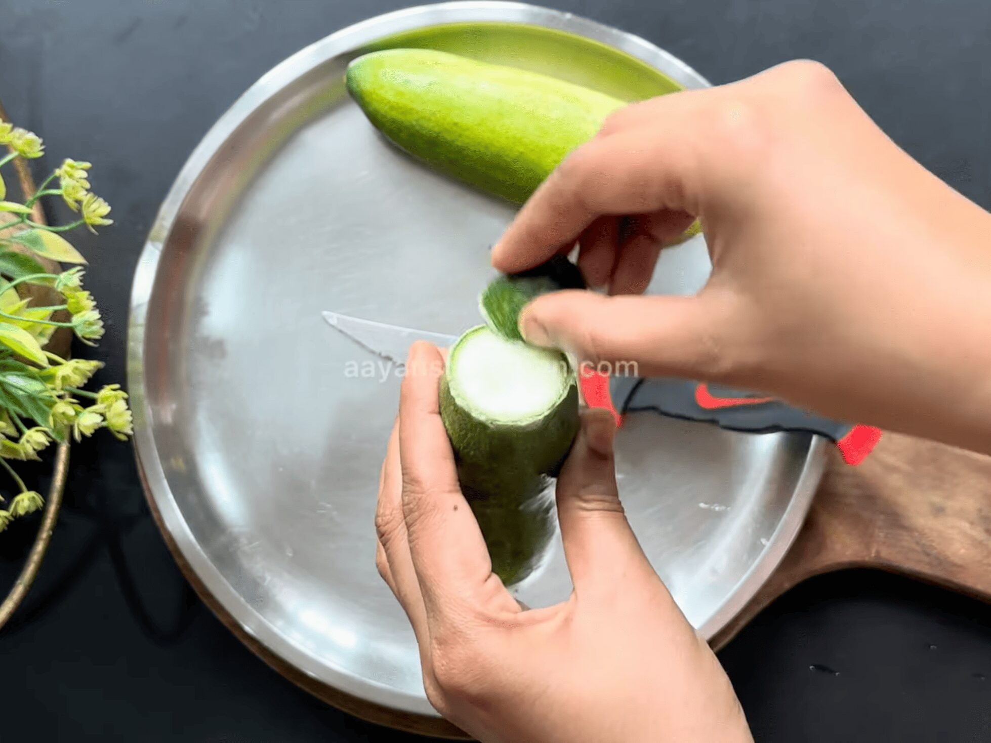 • To make Cucumber Raita, take 2 medium-sized cucumbers. Wash them properly. Now, cut a small piece from one side and rub it so that the bitterness goes away.