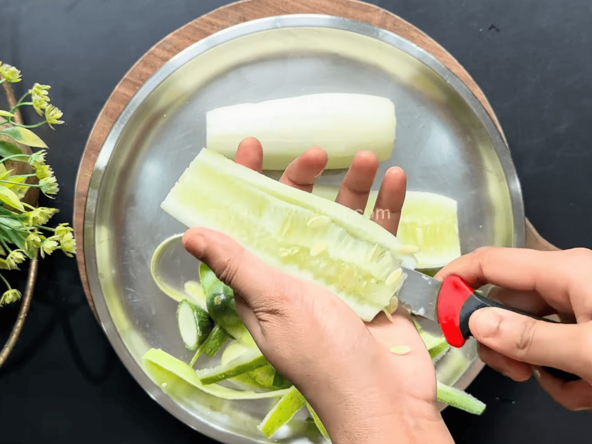 • Next, peel the outer layer, cut it in half, and scoop out the seeds with a knife.