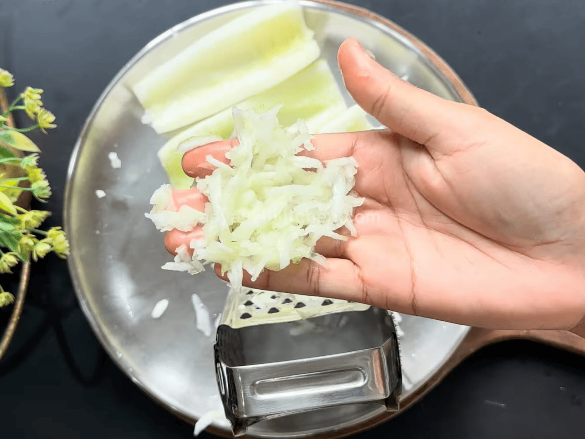 3. Take a grater and grate the cucumbers. Don’t use the small side; use a grater with large holes.