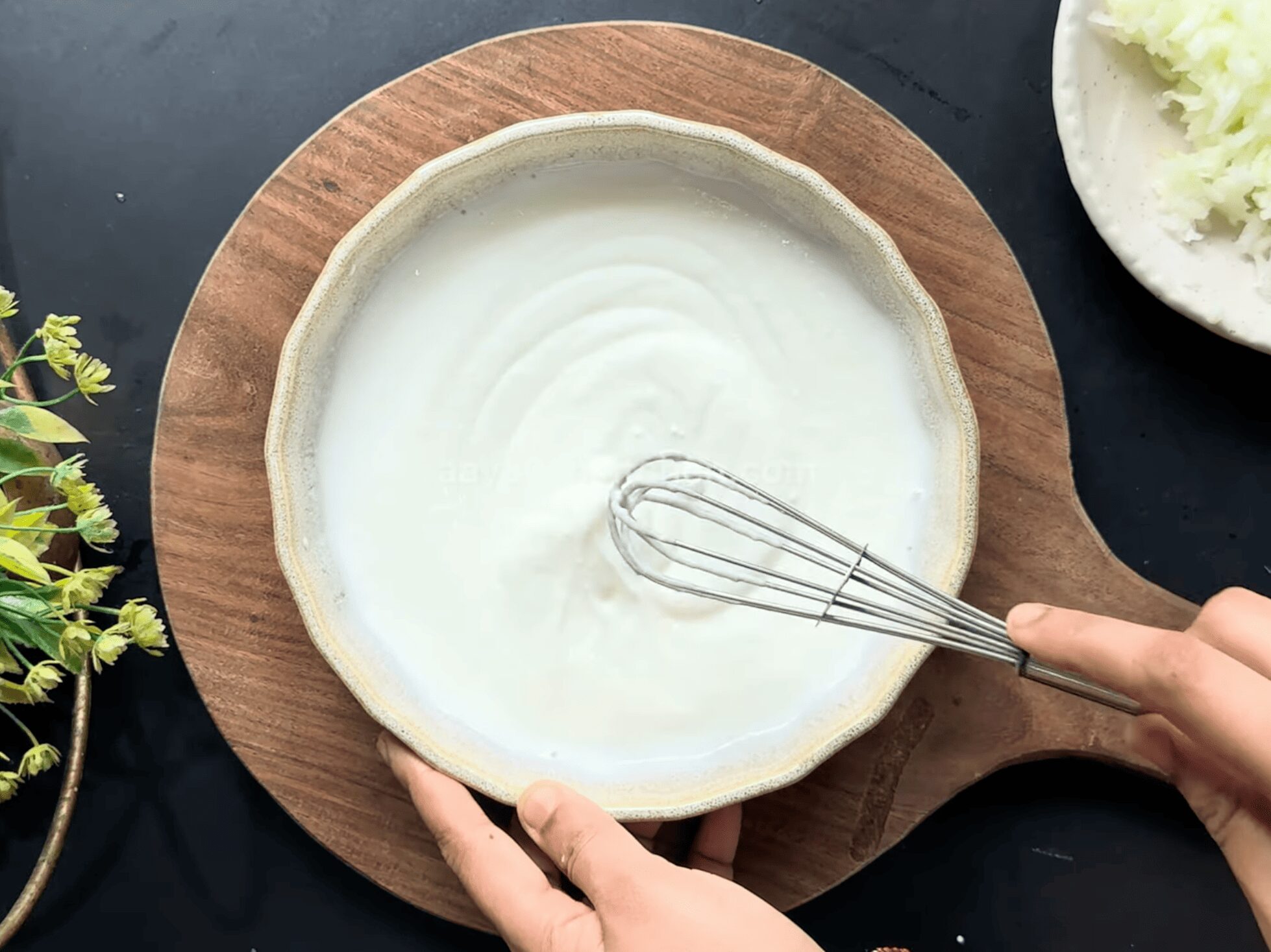 • Now, using a hand whisker, whisk the curd into a smooth paste. If the Curd is very thick, you can add a little bit of water.