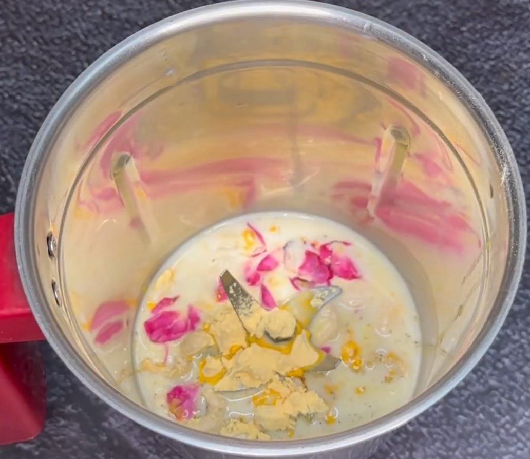 - Take a grinding jar and add soaked almonds, cashew, cardamom powder, saffron strands, custard powder(vanilla flavor) and 12-15 rose petals.