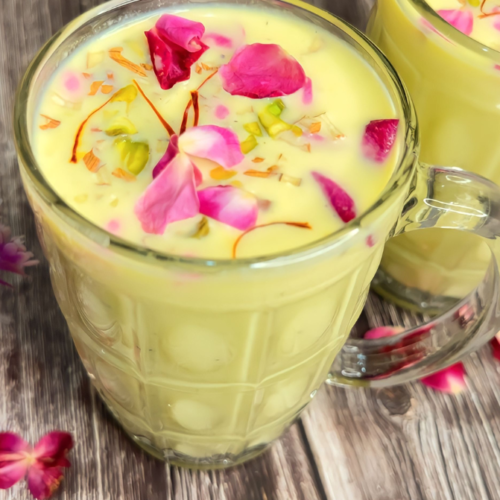 - Pour in a glass and garnish with pistachios, saffron, almonds and rose petals. Enjoy