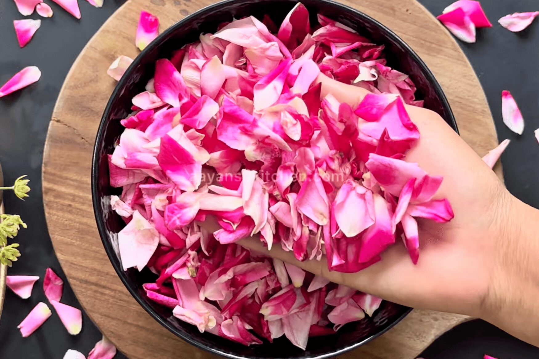 • After mashing all the Rose petals, check them by squeezing them in your hands; the juice will come out nicely.