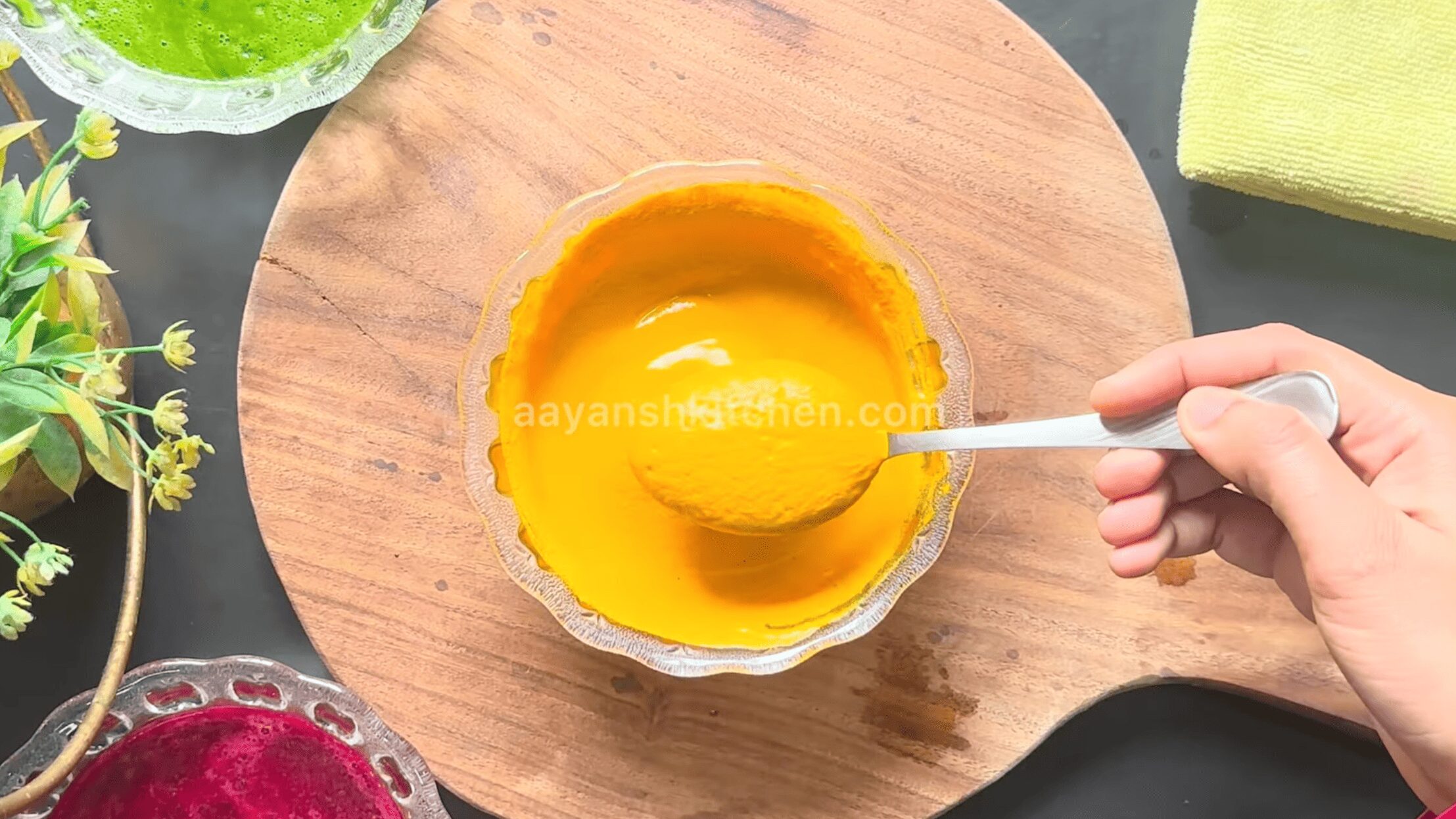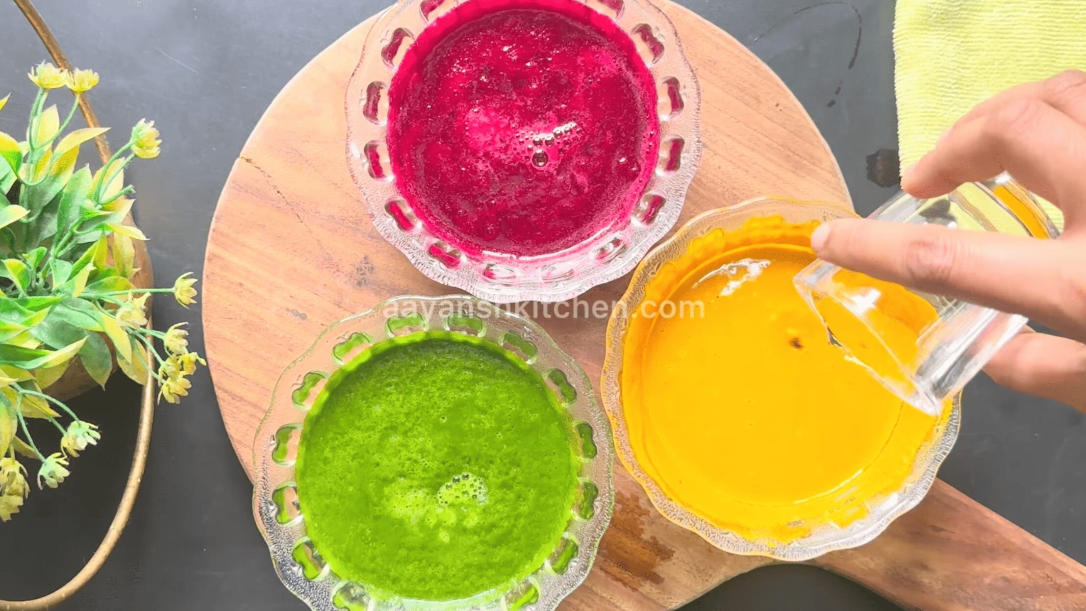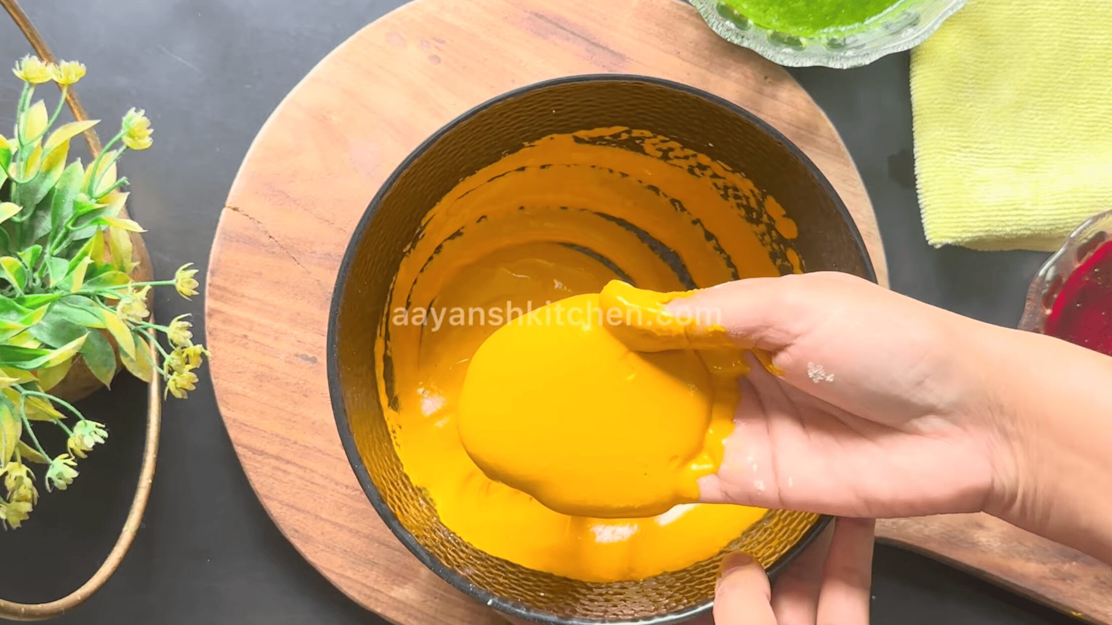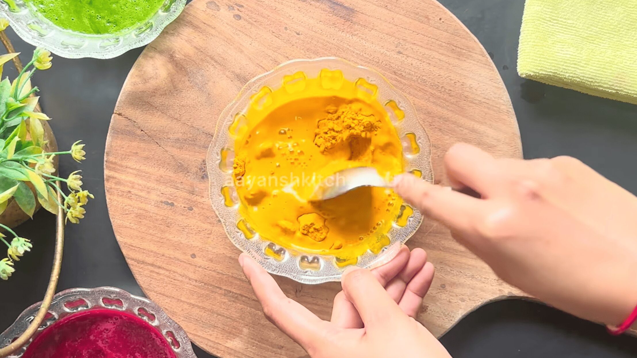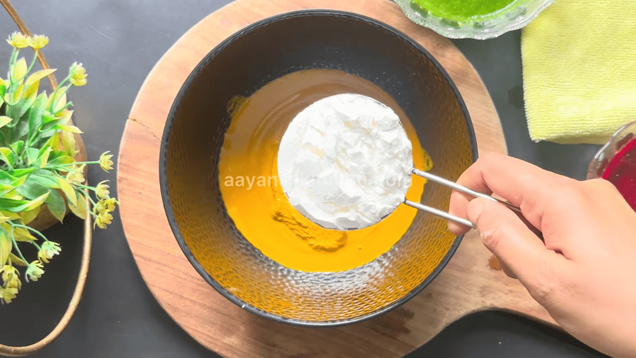 12. Take a large bowl. Add the Haldi Paste, and then 1/2 cup of Cornflour is added to each paste as a base. First, I added Turmeric paste, but you can use any. Repeat the same for the other two pastes as well.
