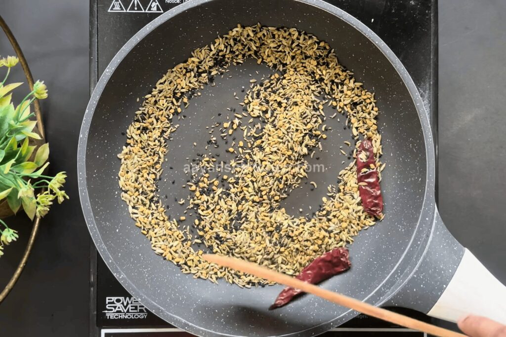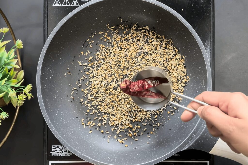 - Now, take a Kadai, add 1/2 cup of Panch Phoran, and 2 dried red chillies. Dry roast on a low heat and then let them cool.