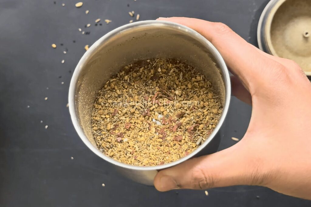 5. Grind the mixture into a coarse powder. Do not make a fine powder. Keeping the spice mixture slightly textured is necessary for the Pickle’s taste and texture.