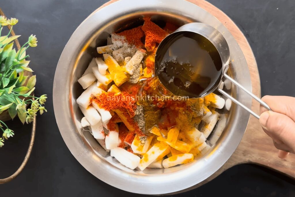 - Now, take a large & deep bowl, combine the chopped and dried Radishes, spice mixture, salt to taste, 5 tbsp turmeric powder, 3 tsp Kashmiri Red chilli powder, 1 tsp homemade Garam masala, and 1/2 cup of Raw Mustard oil.