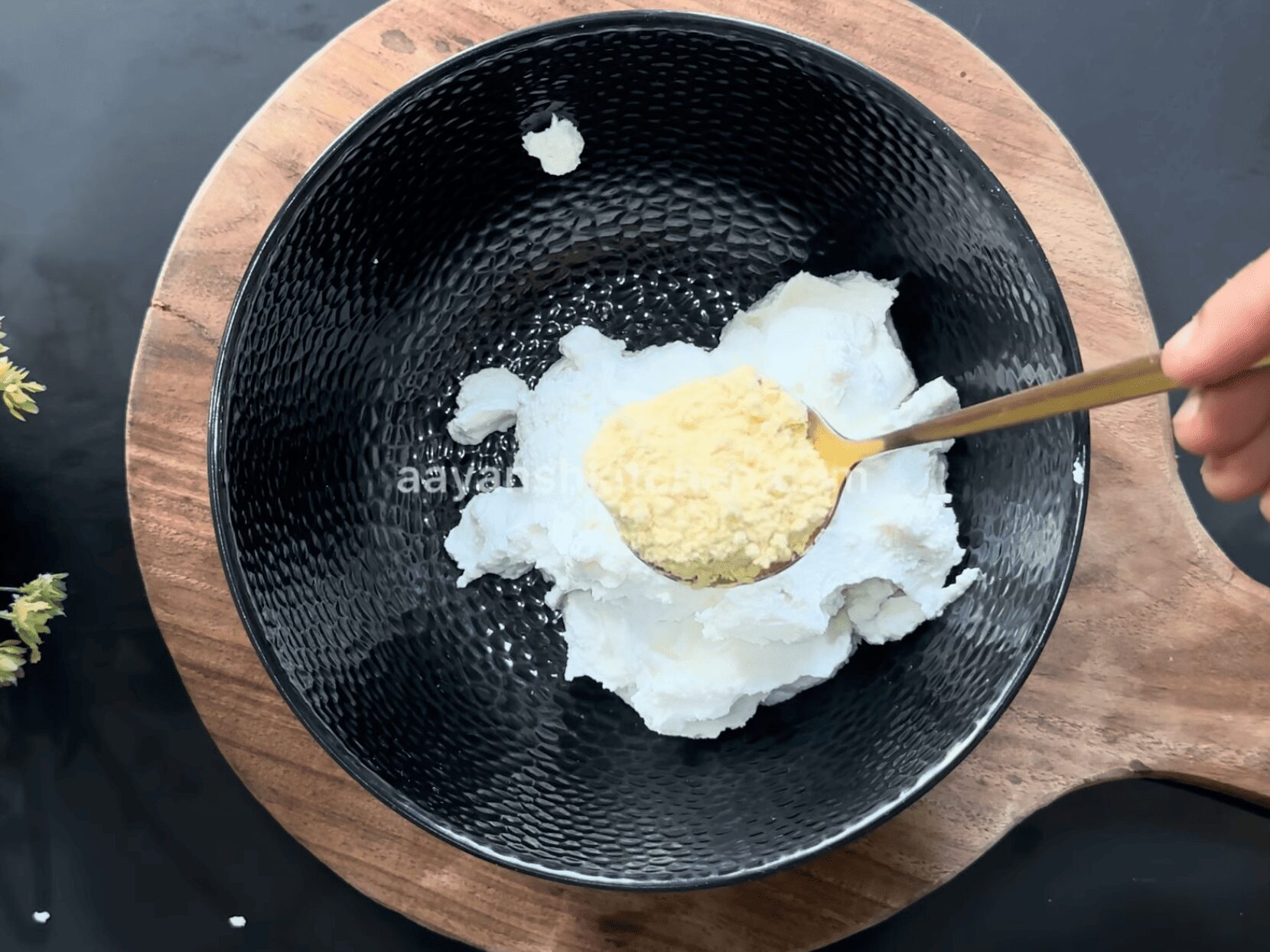 • Transfer the mixture to a mixing bowl. First, add 3-4 tbsp of dry-roasted Besan. Besan helps with binding the Kebab.
