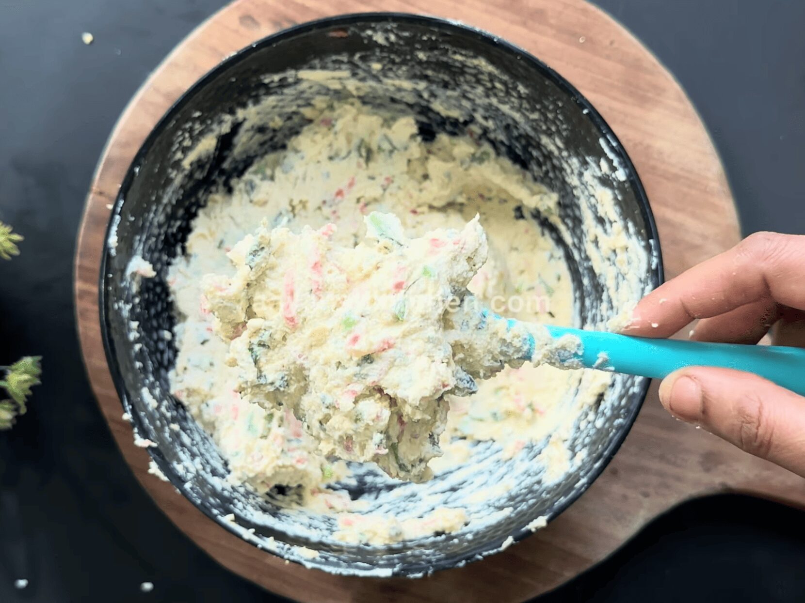 • Now, add chopped veggies: onions, Green capsicum, carrot, coriander, ginger, green chili, along with spices such as salt, red chili flakes, chaat masala, kasuri methi, black pepper powder, and garam masala.