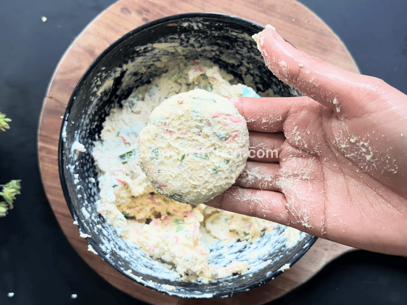 • Grease your hands with oil or ghee. Take a spoonful of the mixture in your hands and form a kebab-like shape.