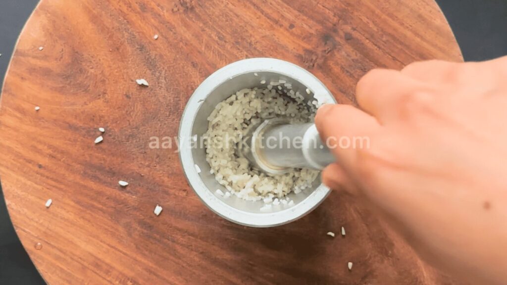 2. Put the rice in a mortar and pestle and pound it a little. The Rice is ready now to make the Kheer.