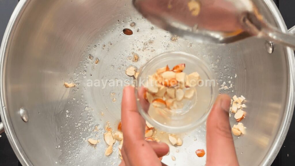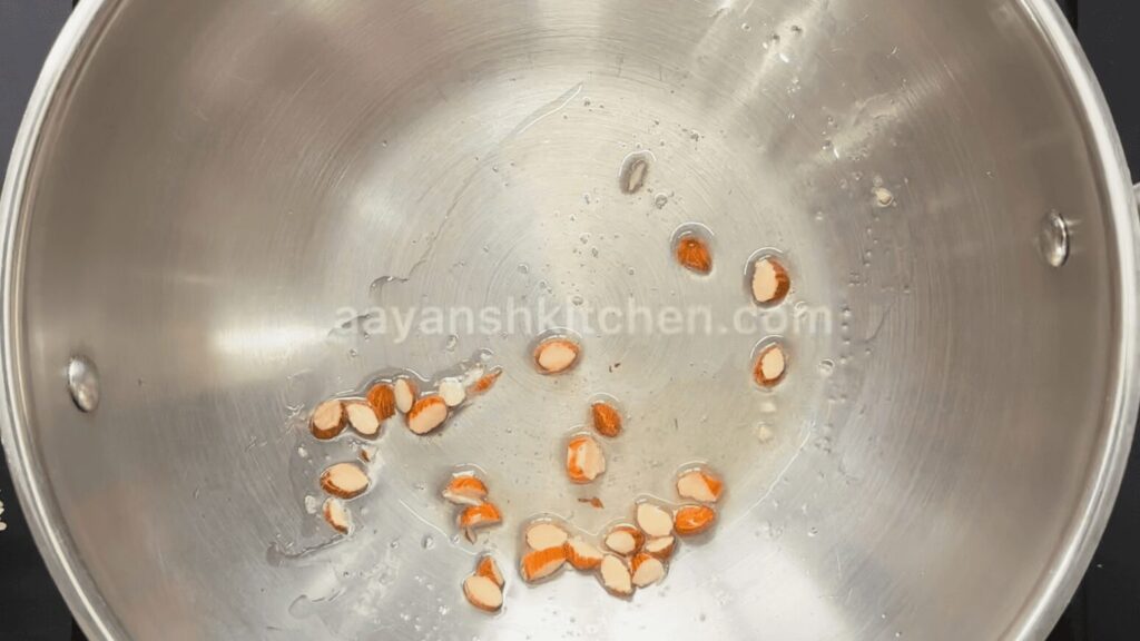 3. Take a Kadai and add a tsp of Desi ghee, and as soon as the ghee gets heated up, add 1 tbsp of chopped almonds and roast them a little.