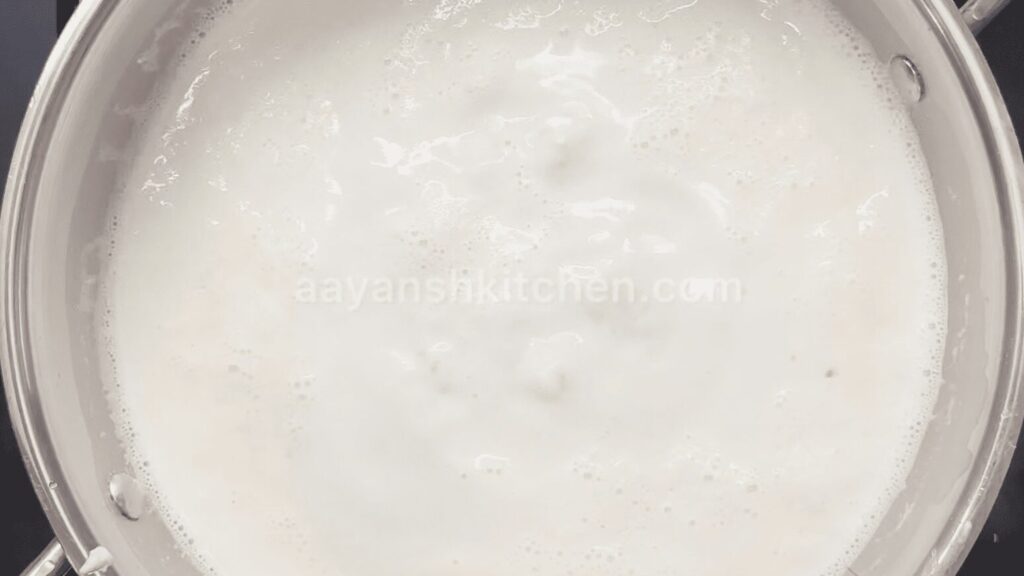 - In a heavy-bottomed pan, add 2 tsp water and full cream milk and bring it to one boil.