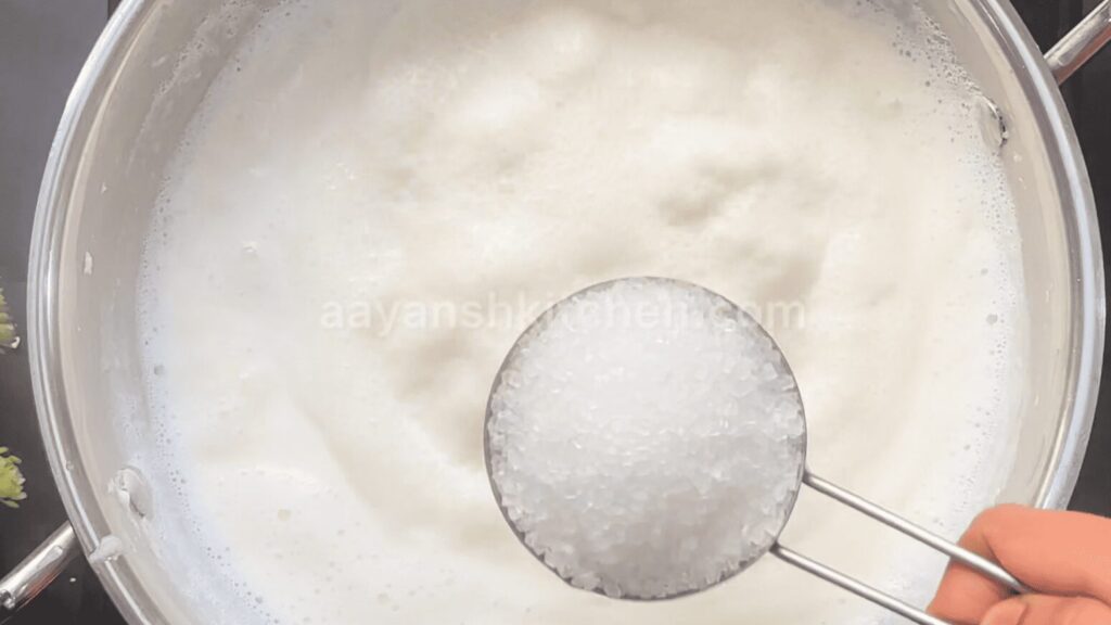 7. After cooking for 5 minutes, add half a cup of sugar to the Kadai.