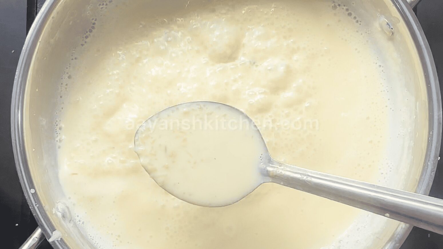9. As you keep cooking the Kheer Mixture, it will thicken and reduce in quantity.
