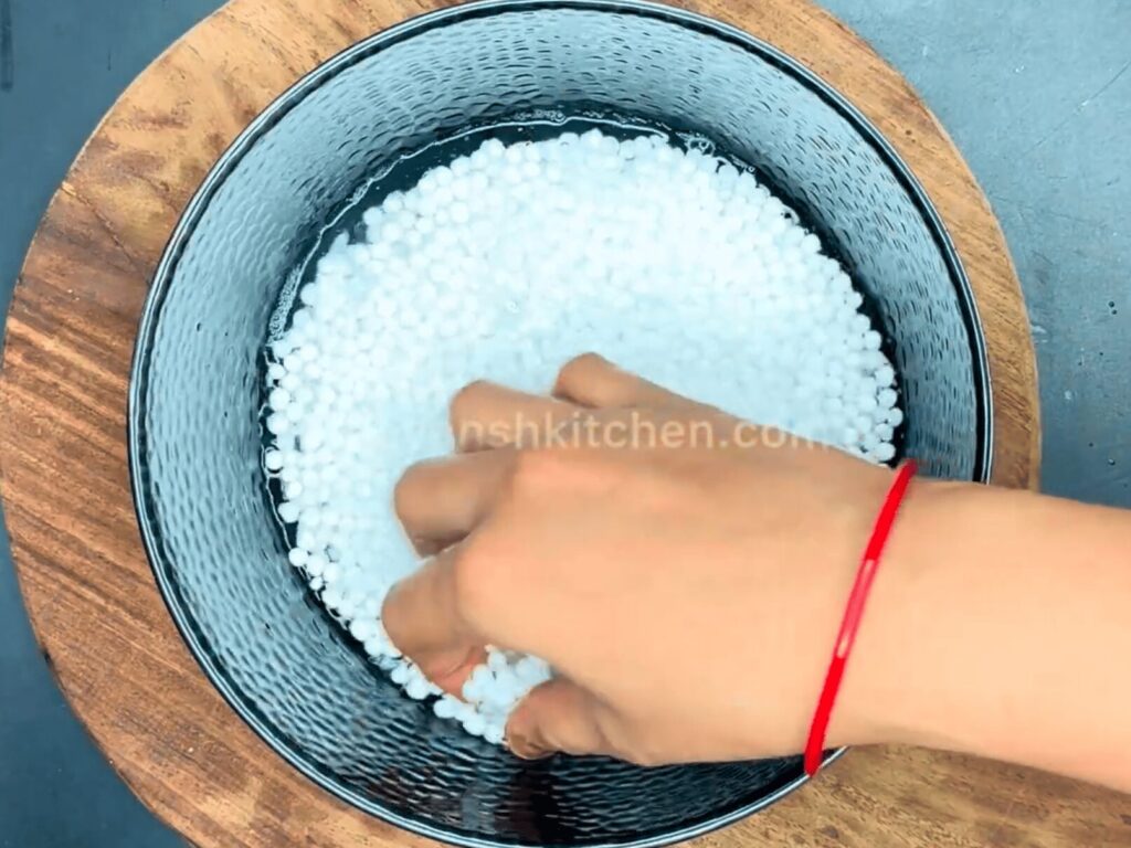 • Add water to the bowl, rinse & wash the Sabudana properly at least 3 times to remove the starch.