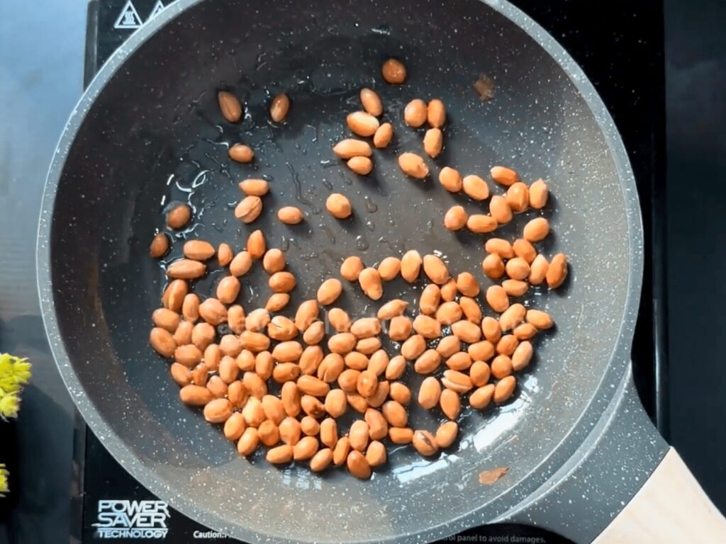 6. When the Ghee heats a little, add 1/2 cup of Peanuts, stir continuously, and roast them on a low to medium flame. Transfer the roasted peanuts to a bowl. We also need to grind half of these roasted peanuts into powder form. Keep the other half as it is.