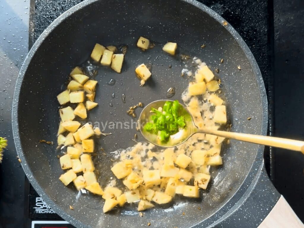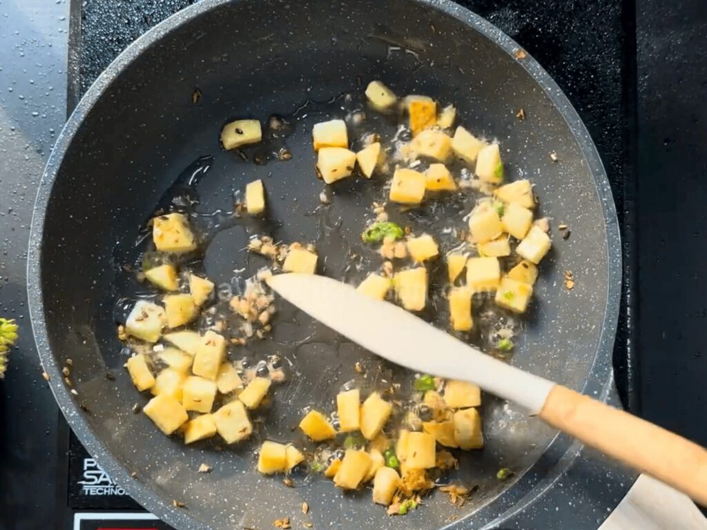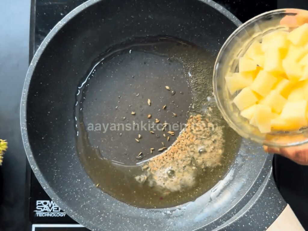 • In the same Pan, take 2 tbsp of Desi Ghee, 1 tsp Jeera, and 1 medium-sized chopped Potato.