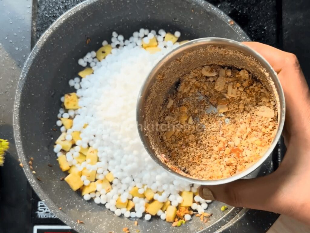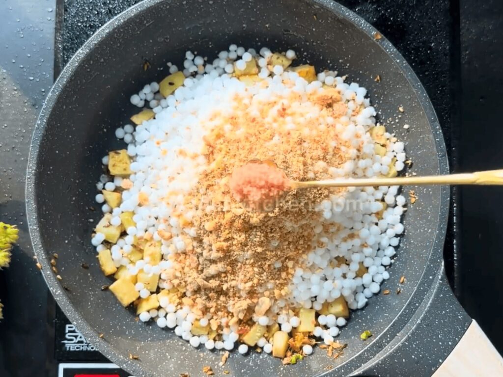 • As soon as the potatoes get cooked, add the Sabudana and the Roasted Peanut Powder. Turn the gas flame to low.