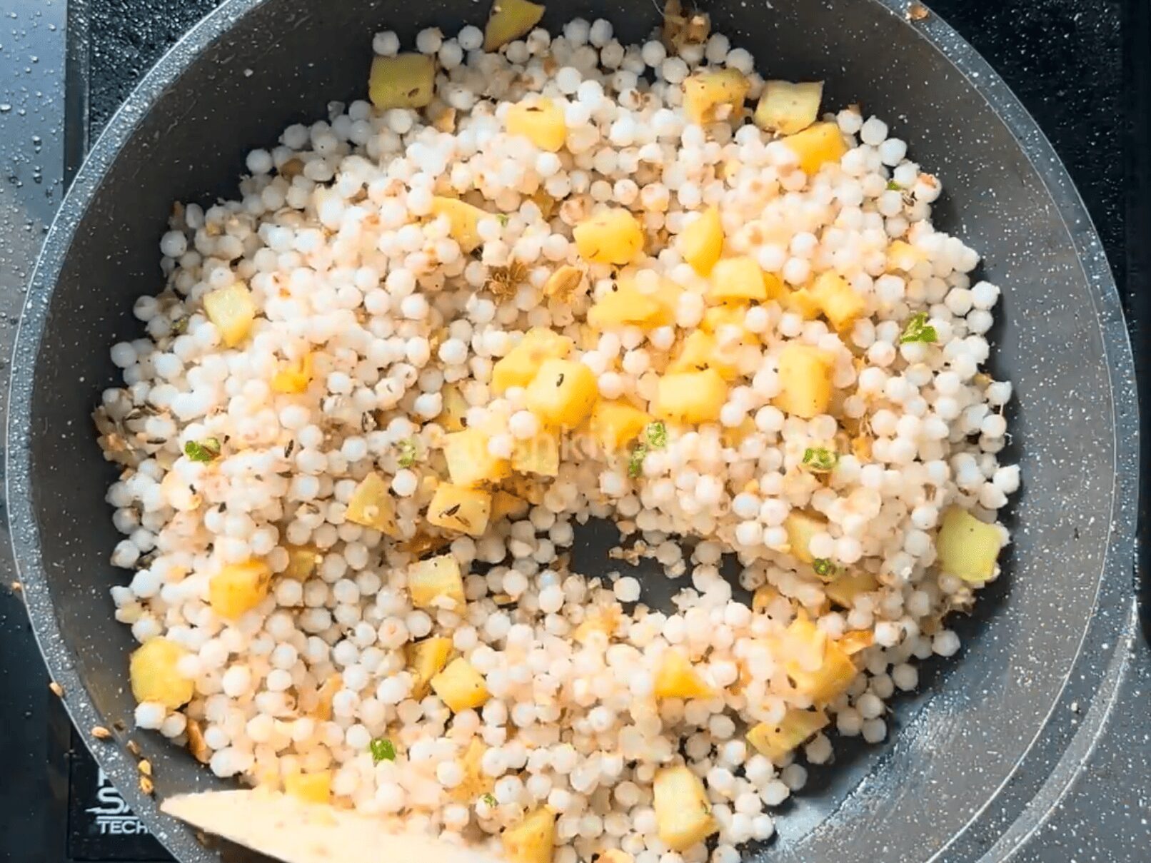 12. Mix everything well and cook on a low flame for a few minutes. We need to cook until the Sabudana gets translucent.