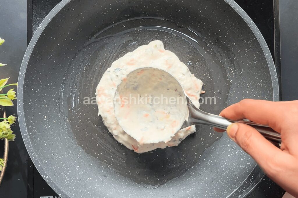 - Now, let’s proceed to cook Chilla. Take a Non-stick Pan, or an Iron Pan, heat it and grease it with desi ghee, and pour 1 big tablespoon of batter.