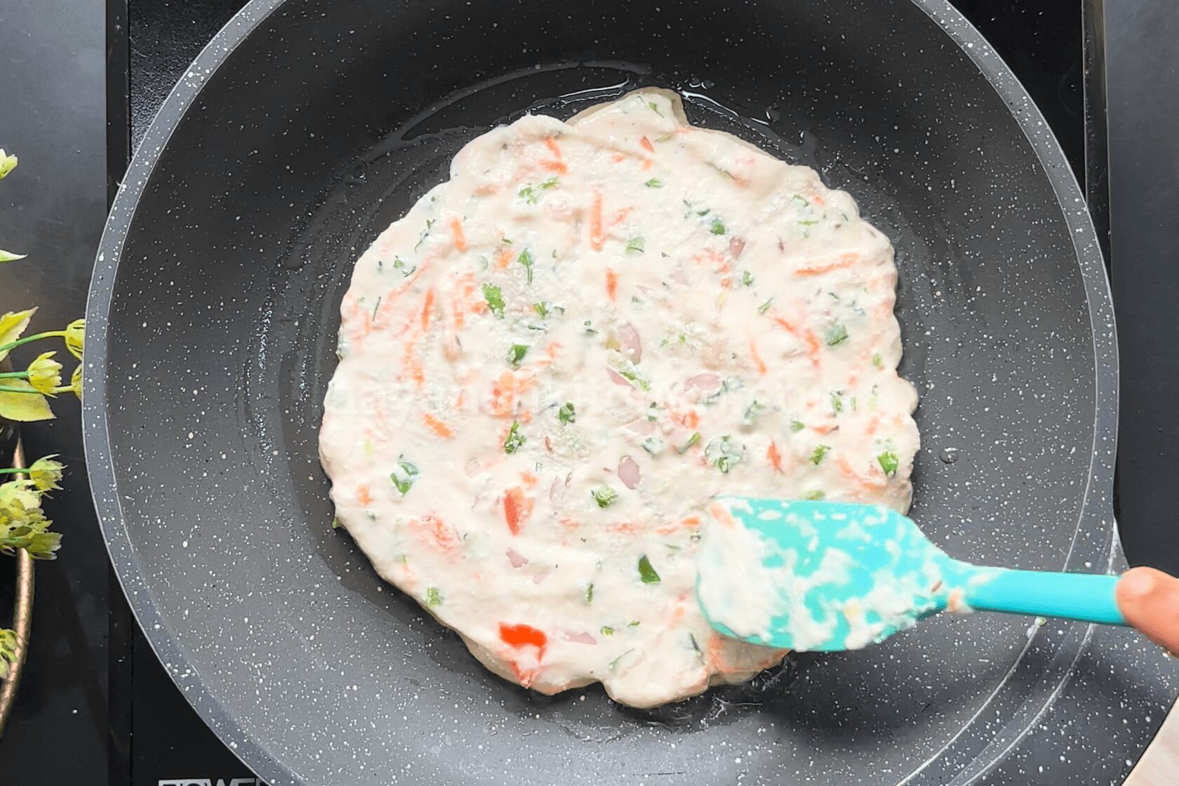 10. Now, let’s proceed to cook Chilla. Take a Non-stick Pan, or an Iron Pan, heat the Pan, and grease it with desi ghee, then pour 1 big tablespoon of batter.