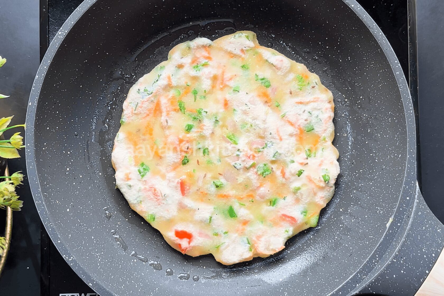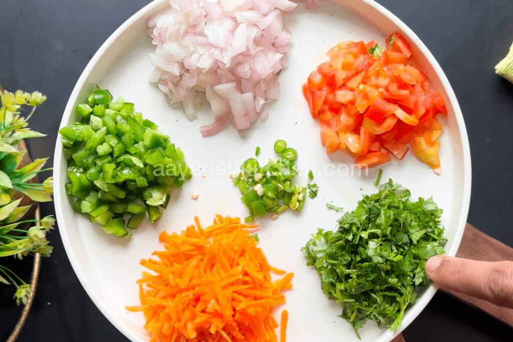 - Now, add the chopped veggies. You can use any veggies as per your preference. Here, I’ve used finely chopped Coriander leaves, chopped tomatoes, chopped Onions, chopped Green capsicum, chopped green chilli, and grated Carrot.
