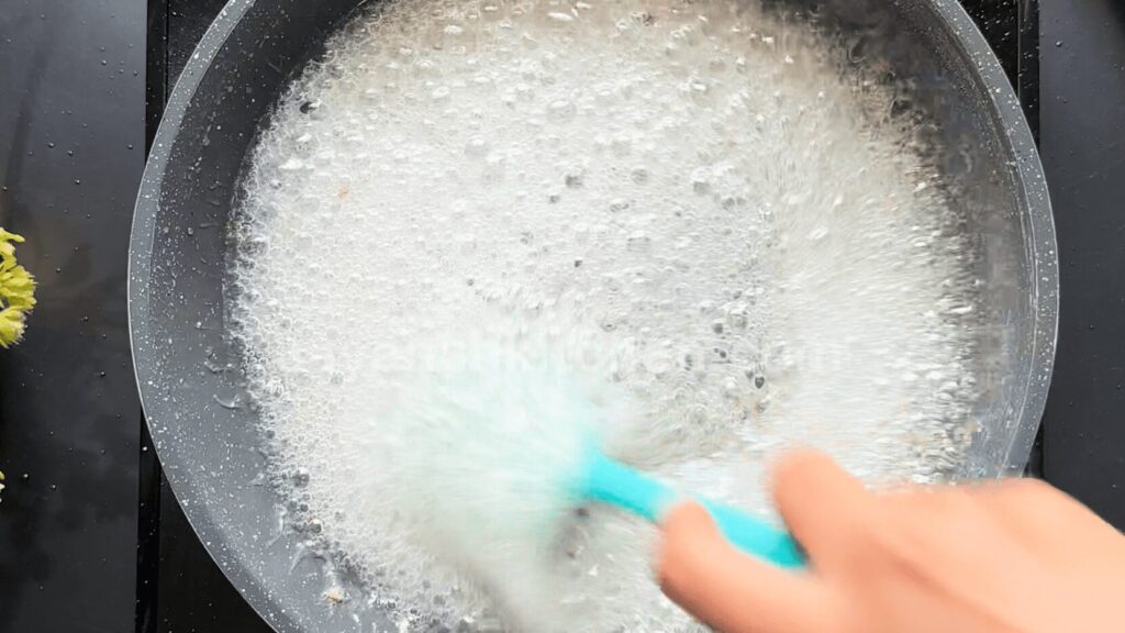 - Let the sugar mixture cook and wait until bubbles appear all over the mixture, and it starts looking white.