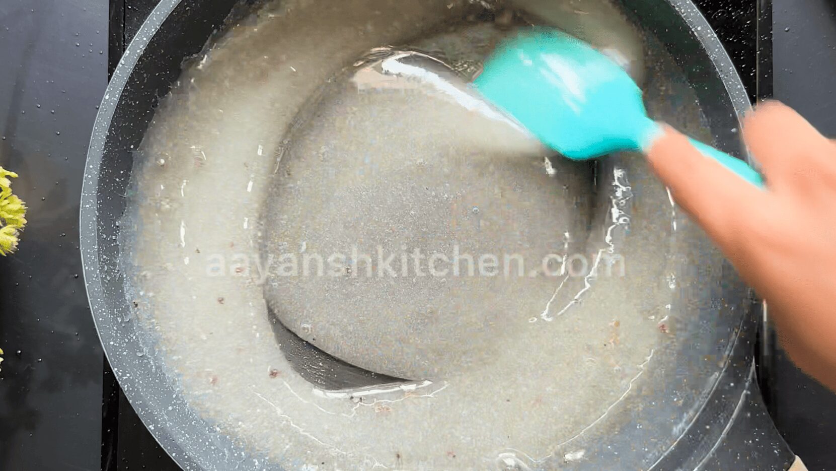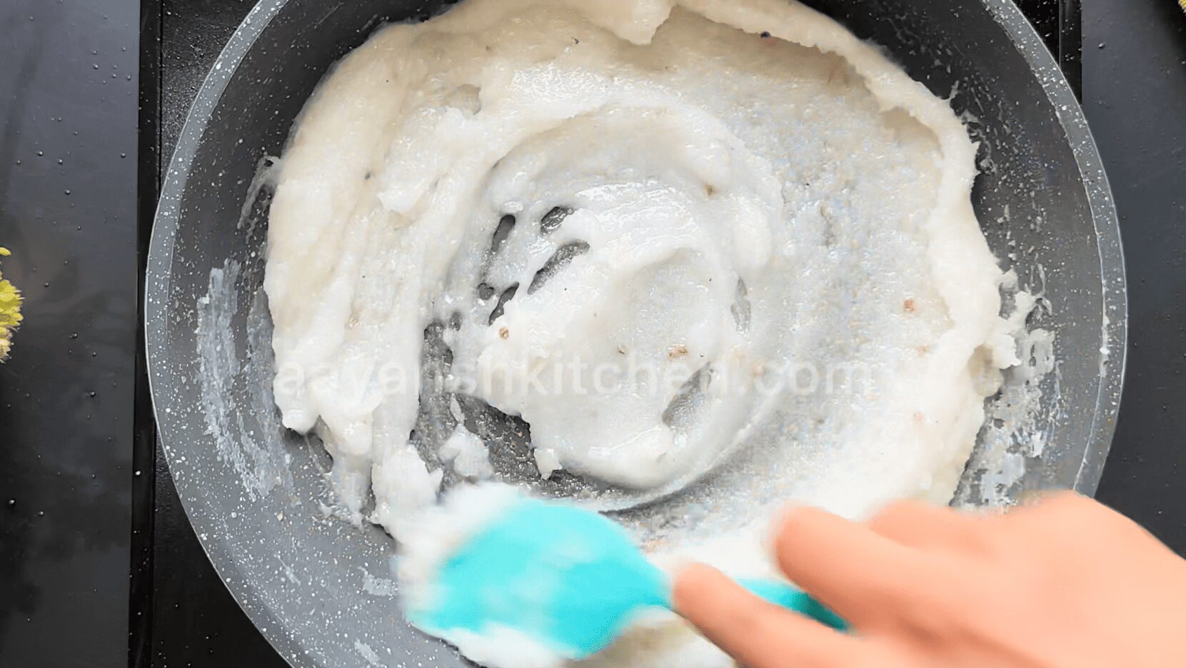 - Turn off the flame and stir the mixture in a circular direction continuously without stopping.